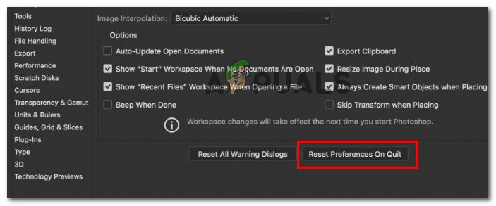 According to some affected users, this Photoshop printing issue can also occur due to a corrupted Preferences file. As it turns out, this file might end up catching corrupted data which might contribute to the sudden crash you’re experiencing when you try to print something directly from Photoshop’s menus.