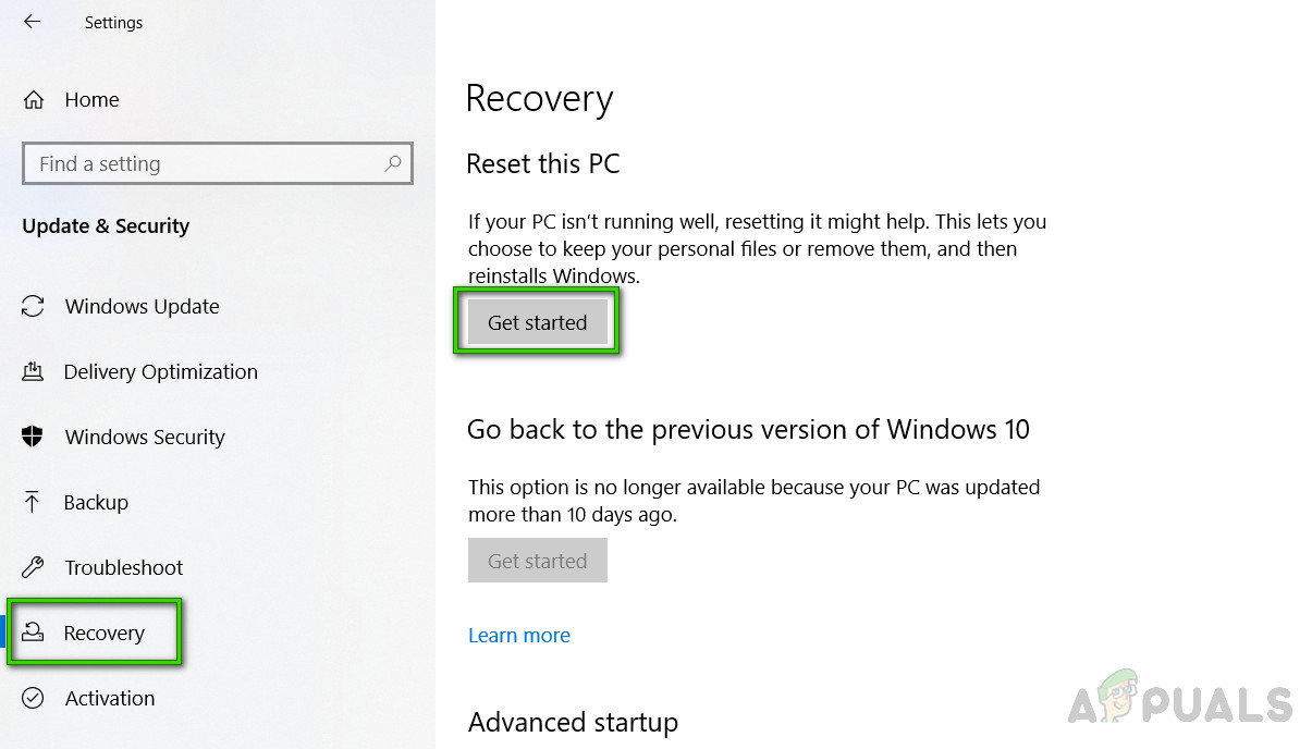 - In the sidebar, choose Recovery and then click Get Started under Go back to the previous version of Windows 10. This will take you to the Recovery Prompt that helps you troubleshoot or downgrade Windows Operating System.