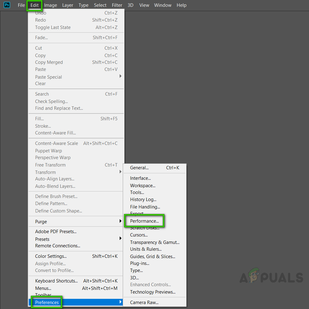 Opening Adobe Photoshop - Go to Edit > Preferences > Performance. This will open Photoshop settings that are relevant to the performance factor i.e. Physical memory settings, History & Cache, etc.