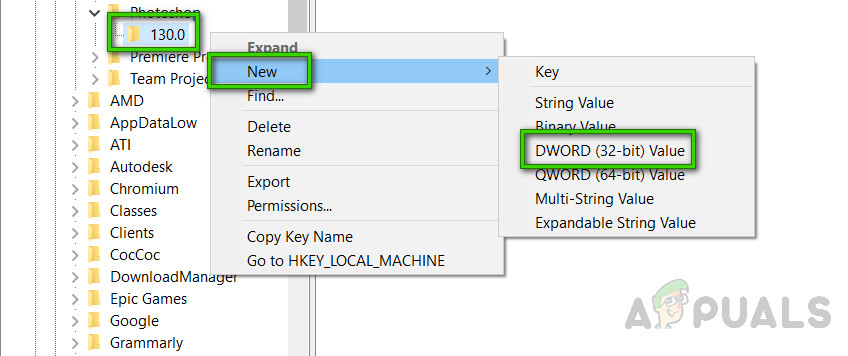 Opening Photoshop Registry Folder - Based on the Photoshop version you’re running, right-click the folder mentioned in the previous step (13.0) and select New > DWORD (32-bit) Value from the menu.