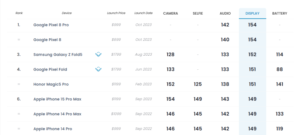 In fact, DXOMARK currently lists the Pixel 8’s displays as the best in the industry right now (154 pts), with the Z Fold 5 sitting at third place (152 pts), and the iPhone 15 Pro Max at 6th (149 pts) .