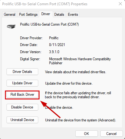 Rolling back drivers means installing their older versions. Some driver updates are incompatible with some computers and will fail to run. This can be the reason why you’re facing PL2303 driver issues on your Windows 11 system.