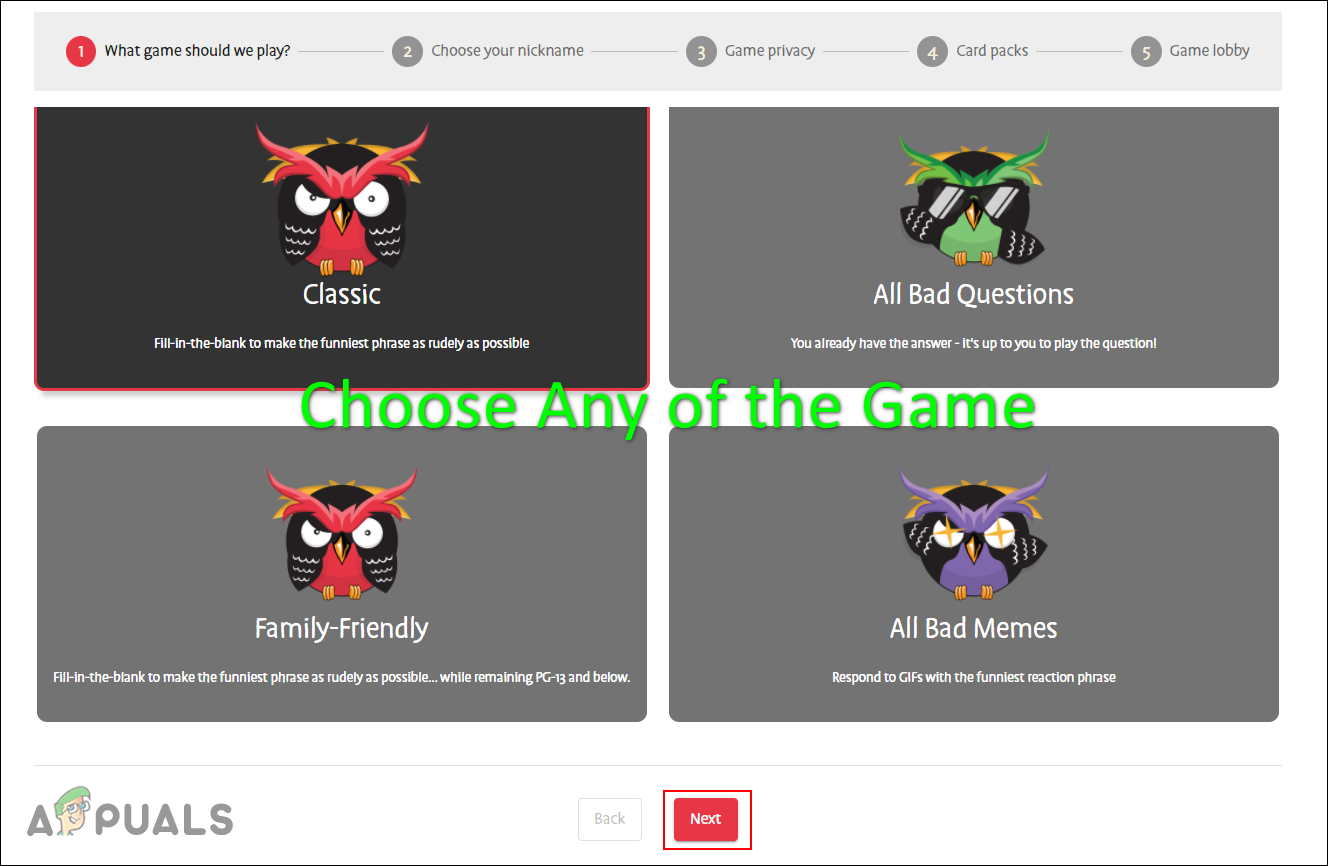 - When you click on the New Game, you get to choose between four different options. Choose any of the options and click on the Next button.