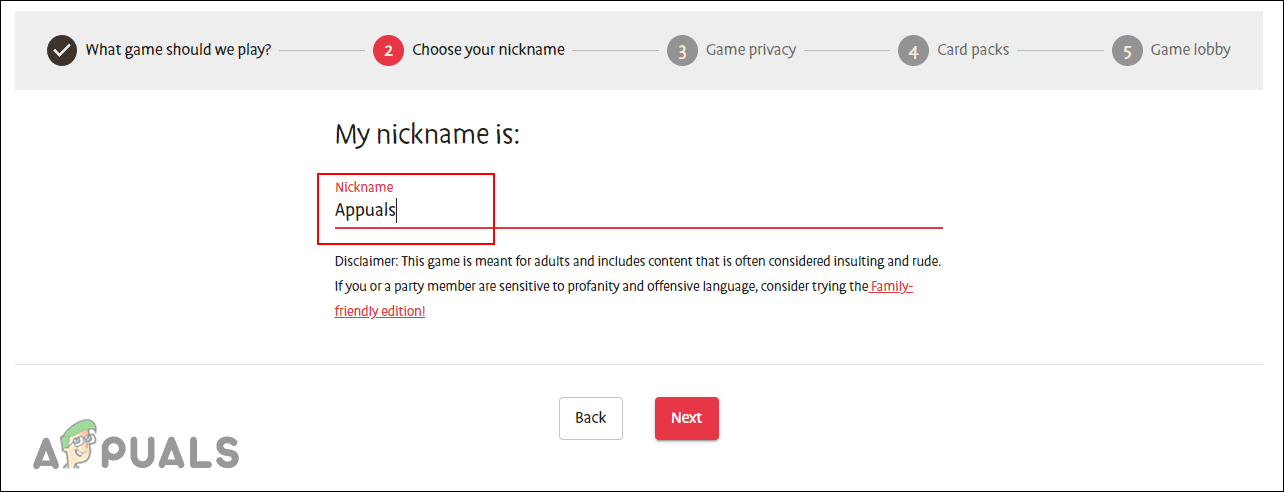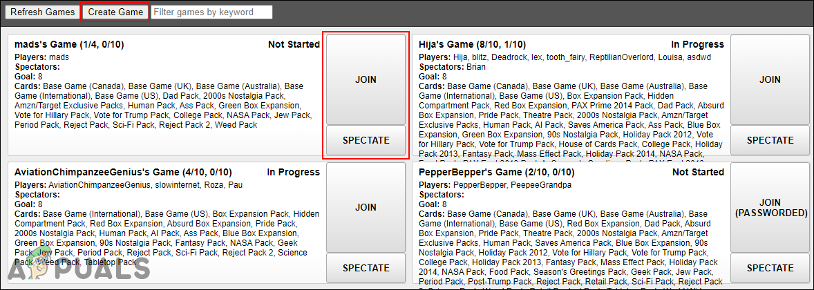 Another site where you can play cards against humanity game is “Pretend you’re xyzzy”, which is a bit old theme website. Unlike the All Bad Cards, this one is pretty simple with no colorful designs or whatsoever. You just need to set a nickname and then head over to the game page where you can start new or join any ongoing ones. It also allows you to spectate any of the games. Check the below steps to see how it works: