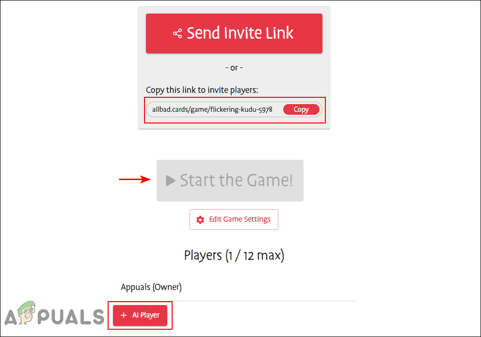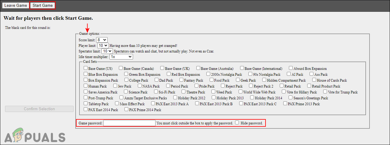 Inviting friends and starting the game - Once you have more than one player, you can click on Start the Game button. Now you can play the Cards Against Humanity game online. Start the round, check the question, cards, and choose the winner of the best card.