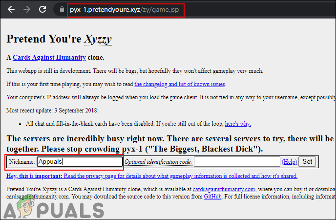 - Open your browser and go to the Xyzzy site. Accept the terms if asked, then type your Nickname for the game, and click the Set button.