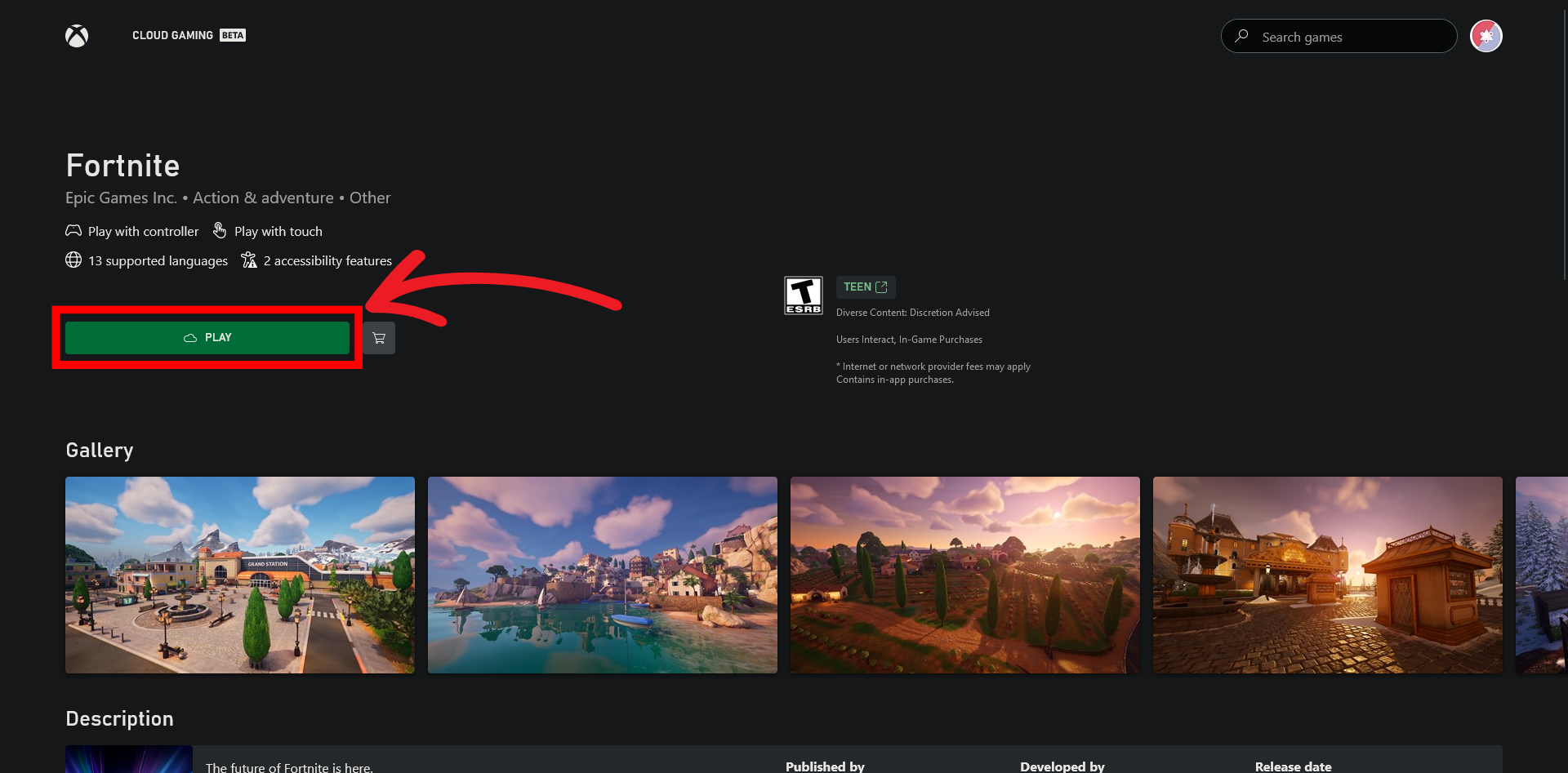 - Play: Select Fortnite and click Play.