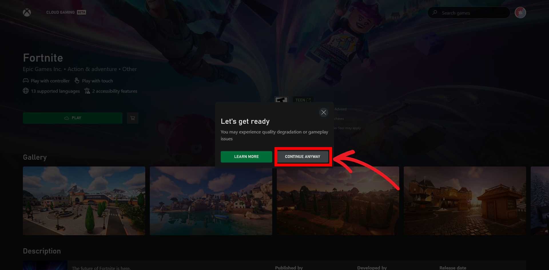 - Enjoy: Fortnite will launch in your browser via Xbox Cloud Gaming on your Chromebook.