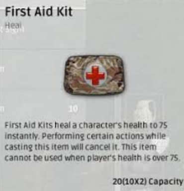 First Aid kits are less common than bandages but are more effective in healing. A first aid kit takes 6 seconds to cast and, unlike bandages, will heal a player to 75% health instantly. As they are difficult to find, one should use them sparingly. Just like bandages, the first aid kit cannot be used if a player has 75% or more than 75% health.