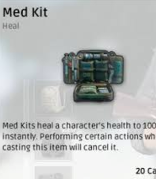 The rarest and best healing item in the game is the Med Kit. This item is very rarely found in houses and occasionally spawns in air drops. The med kit, upon usage, will heal the player’s health to 100% after an 8 second cast time. Use this item very carefully and try to save it for the late game.
