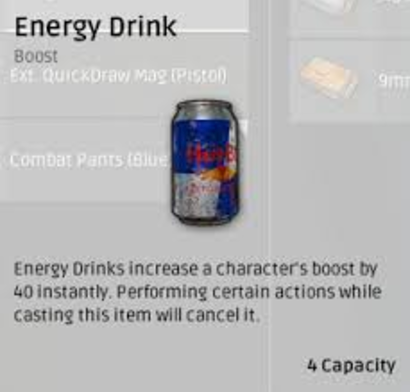The energy drink is the most common boost item. It can be found nearly everywhere and has a fairly high spawn rate. The energy drink takes 4 seconds to cast and raises the boost meter by 40%. The boost will last for 2 minutes and will heal a total of 23% health.