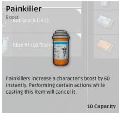 The next tier of boost item is the painkiller. It has a lower spawn rate than the energy drink. It has a cast time of 7.5 seconds and raises the boost meter by 60%. The boost from a painkiller will last for 3 minutes and heal a total of 40% health.