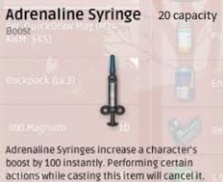 The best and rarest boost item is the Adrenaline Syringe. Only found in airdrops, the adrenaline syringe will max out the players boost meter. It will last for 5 minutes and heal a whopping 68% health.