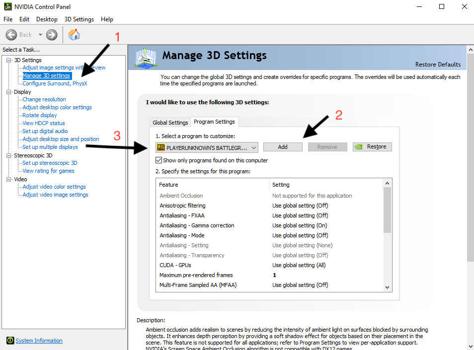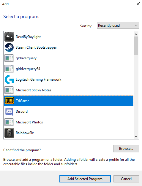 - Click the program settings menu and select “TslGame”. If it is not available, click add and navigate to the game executable located in the steam directory under \common\PUBG\TslGame\Binaries\Win64\
