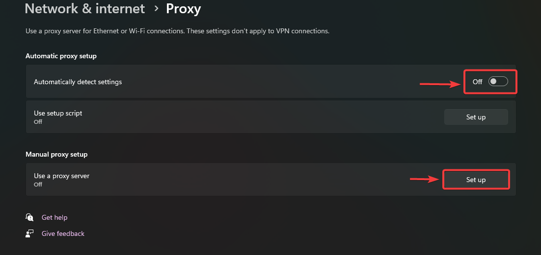 - Under Manual proxy setup, ensure Use a proxy server is turned off.