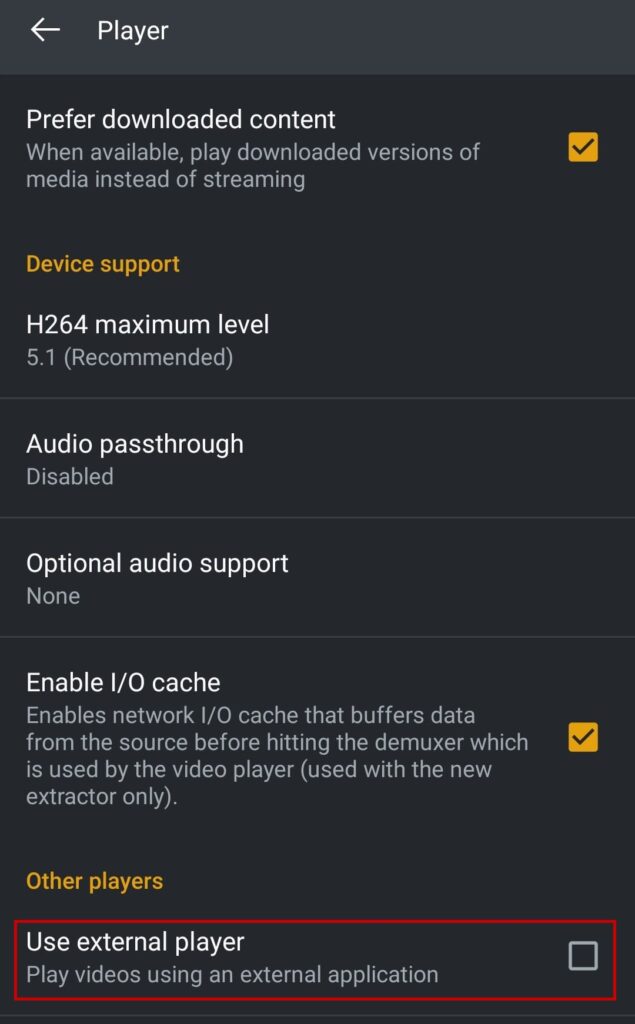 - Uncheck the Use External Player option under Other Players.