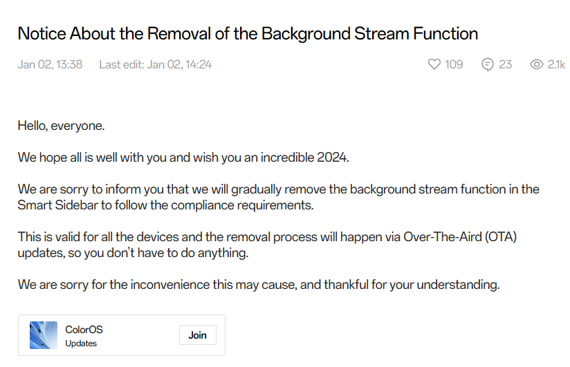 The news broke on OPPO’s Community, where the company said that in order to comply with regulations, they will be removing the Smart Sidebar’s background stream feature. All devices will be updated immediately.