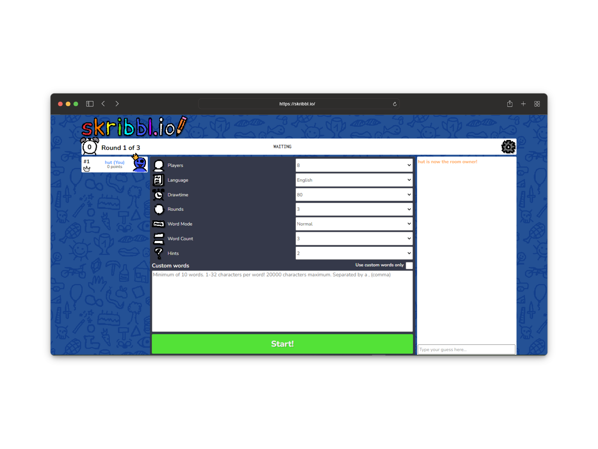 Each game consists of three rounds. In every round, one player gets to pick what to draw from three random words. After choosing, you have 80 seconds to draw, while the others try to guess by typing in the chat. The first correct guess gets the most points, the second gets a bit less, and so on.