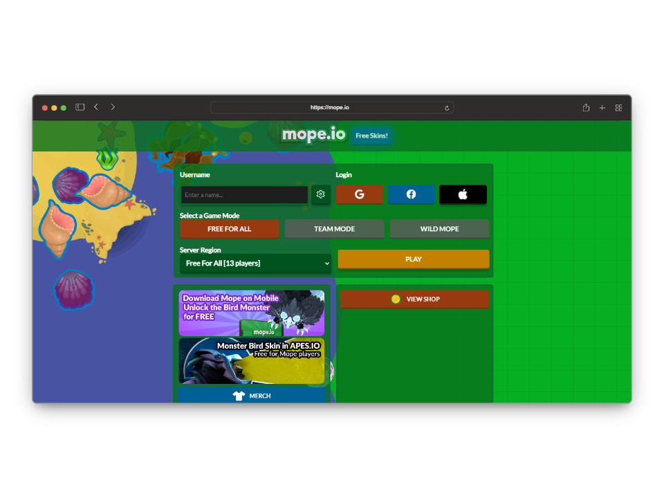 Mope.io is a survival game where you play as an animal trying to get bigger and evolve. The game offers three different game modes: Free For All, Team Mode, and the unique Wild Mope mode. While you’ll find plenty of players in Free For All, the other two modes might be a bit quieter.