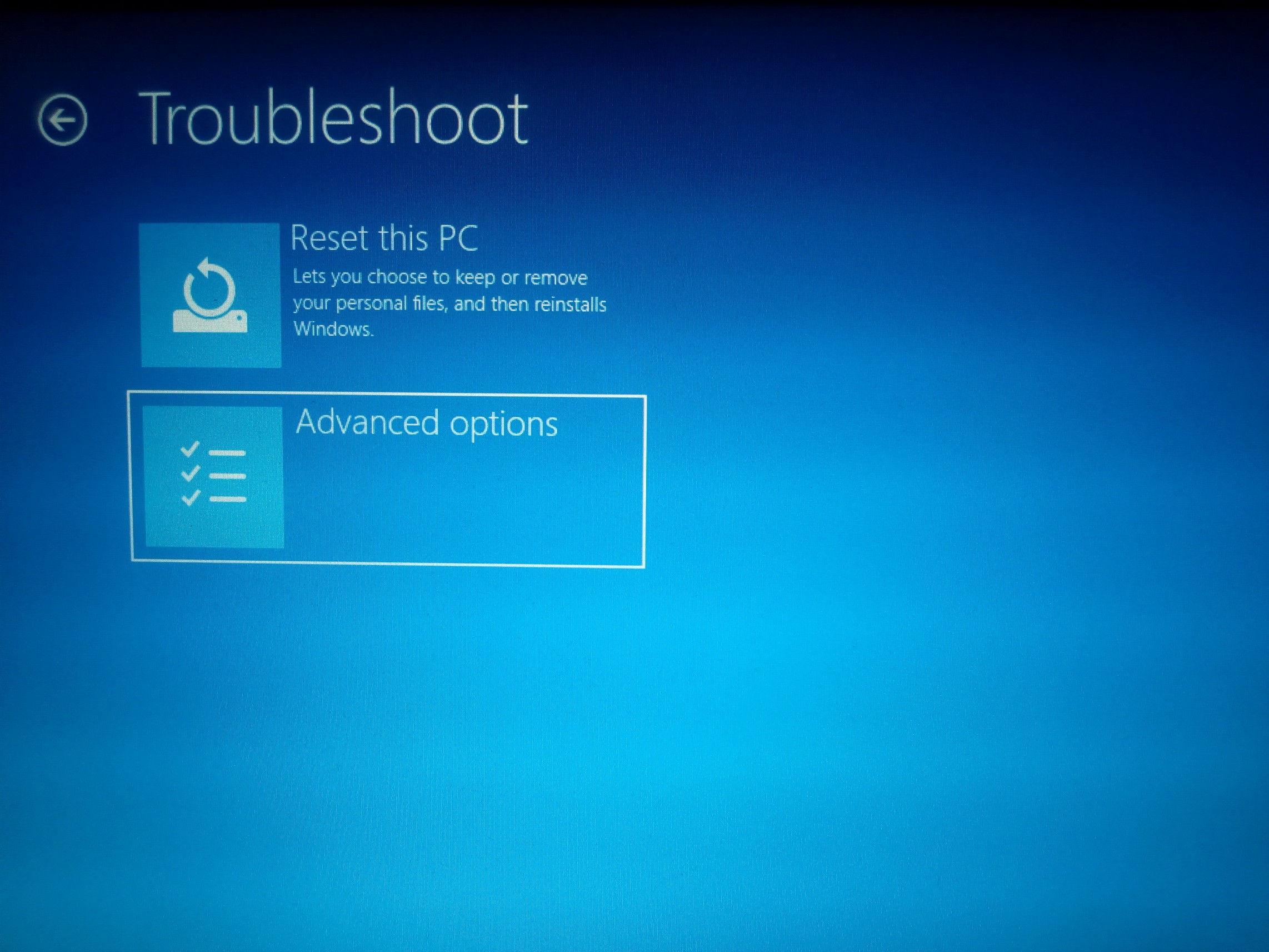 - Open the advanced recovery options, click “Troubleshoot,” then “Advanced”.