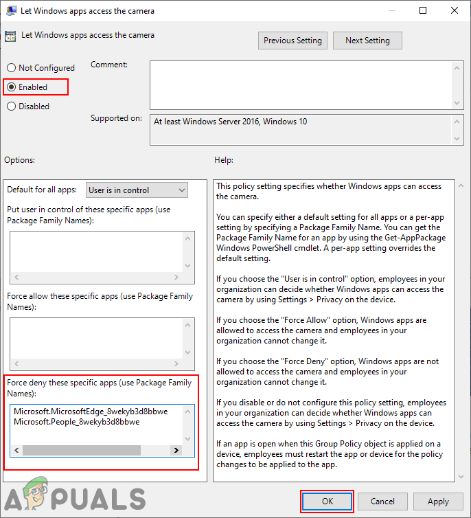 Navigating to the setting - Double-click on the “Let Windows apps access the camera” setting. You can choose the Enabled option and then provide the Package Family Names (PFN) of apps in the following three boxes for different options as stated. Click the Apply/Ok button to save the changes for this setting.