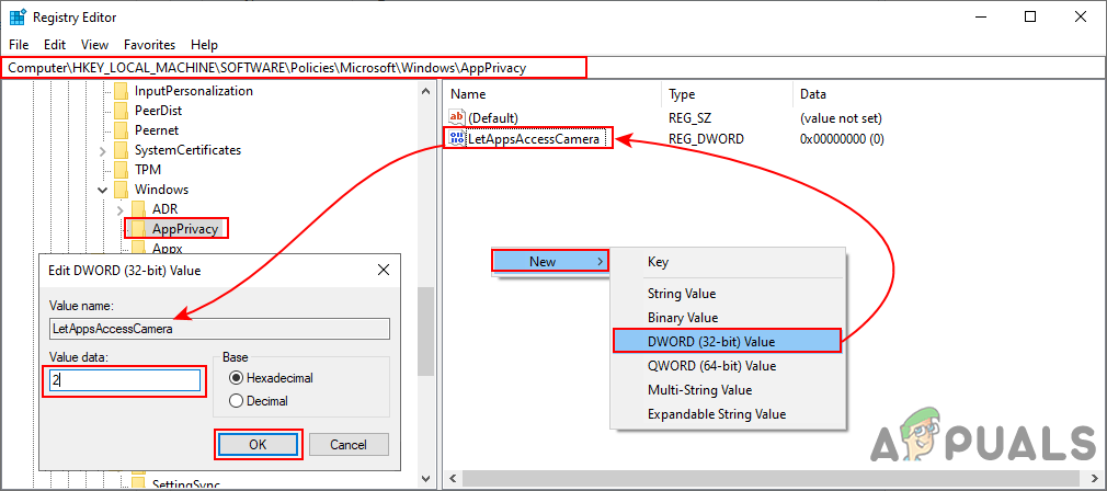 Creating missing key - Create a new value “LetAppsAccessCamera” by right-clicking on the right pane and choosing New > DWORD (32-bit Value). Double-click on it and change the value data to 2.