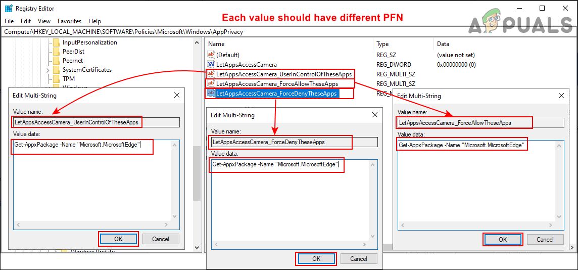 Creating new value and changing value data - If you want to create a value of these three options where you can add applications names like in Group Policy Editor. Then create three values by right-clicking on the right pane and choosing New > Multi-String Value option. Name them as “LetAppsAccessCamera_UserInControlOfTheseApps“, “LetAppsAccessCamera_ForceAllowTheseApps“, and “LetAppsAccessCamera_ForceDenyTheseApps“.