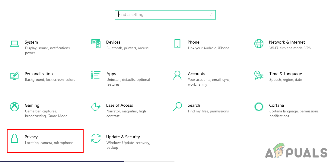 - Hold the Windows key and press the I key to open the Windows Settings. Click on the Privacy setting in the Settings window.