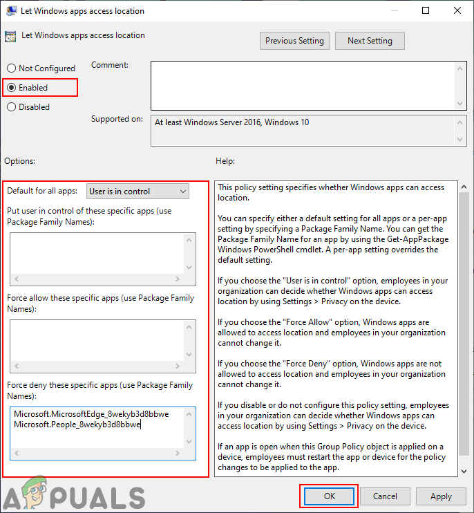 Navigating to the setting - After that, double-click on the “Let Windows apps access location” setting. Select the Enabled option and set the below options as needed. You can set one of the three options as the default for all apps. You can also set these three options for any specific application by adding the Package Family Name (PFN) in the box.