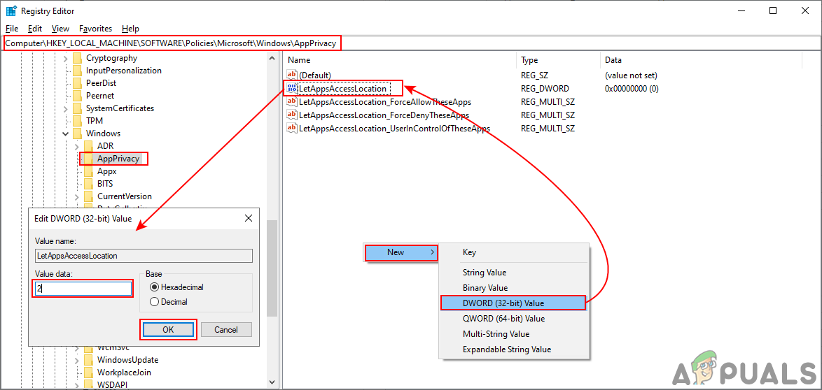 Creating missing key - After that right-click on the right pane of the key and choose New > DWORD (32-bit Value). Name it as “LetAppsAccessLocation“, double-click on it to open and change the value data to 2.