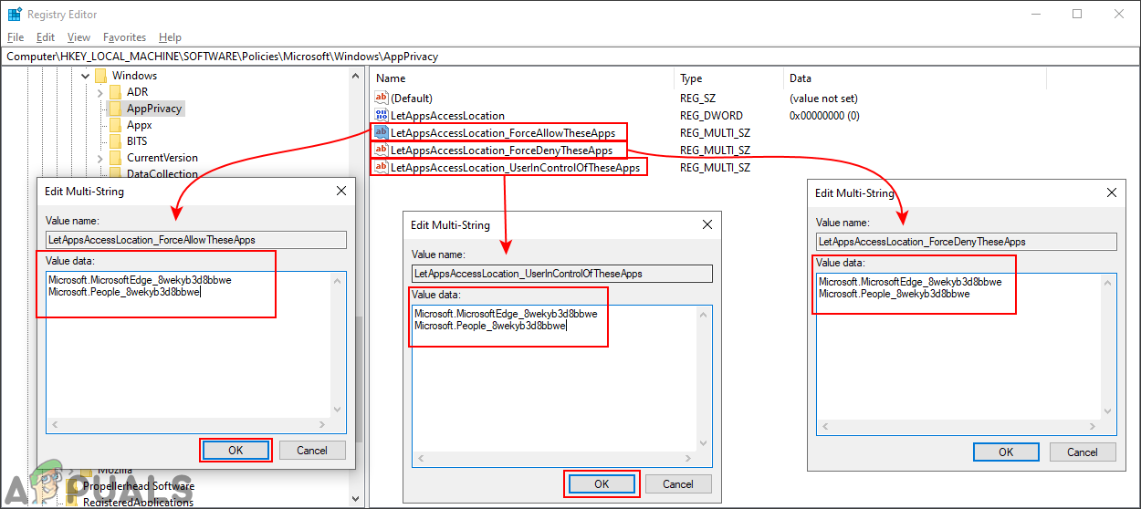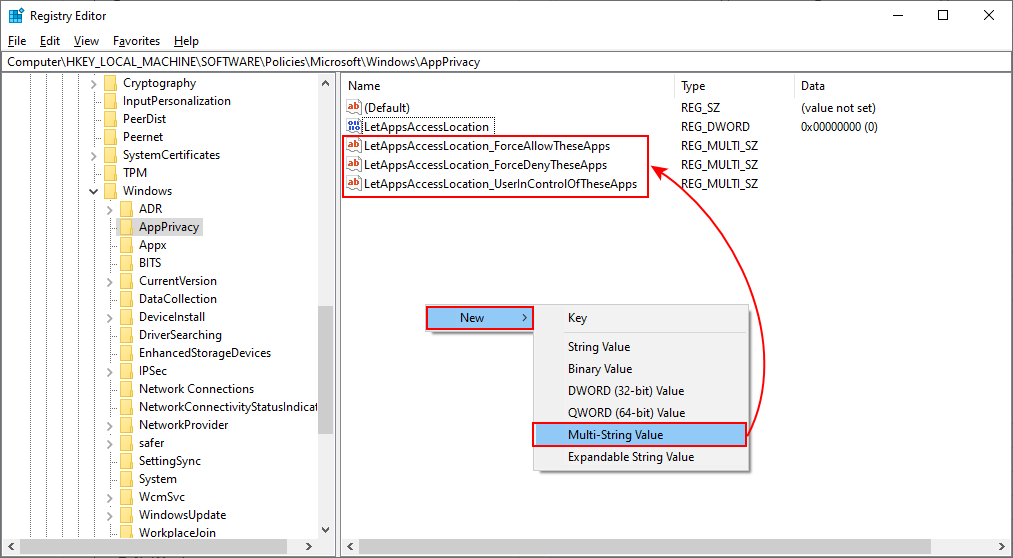 - For user in control value, name it as “LetAppsAccessLocation_UserInControlOfTheseApps“. For force allow, name it as “LetAppsAccessLocation_ForceAllowTheseApps“. And for the force deny, name it as “LetAppsAccessLocation_ForceDenyTheseApps“.