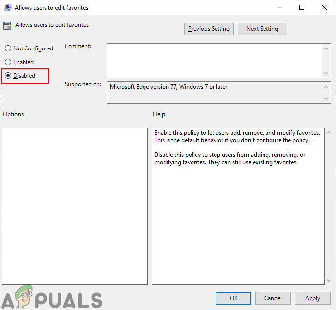 Navigating to the setting - Double-click on the setting named “Allows users to edit favorites” and it will open up in another window. Then you need to change the toggle option from Not Configured to Disabled.