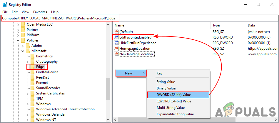 Creating the missing key - Right-click on the right pane and choose the New > DWORD (32-bit) Value option. Rename this value as “EditFavoritesEnabled“.