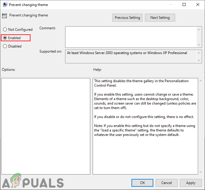 Force updating the group policy - If you want to enable the theme settings again, just change the toggle option to Disabled or Not Configured in step 3.