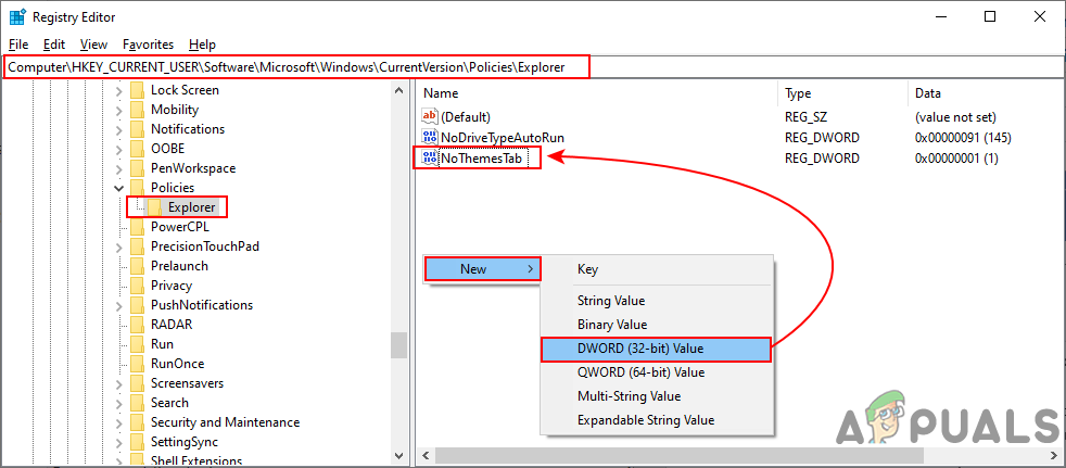- Right-click on the right pane of the Explorer key and choose the New > DWORD (32-bit) Value option. Then rename the value as “NoThemesTab” and save it.