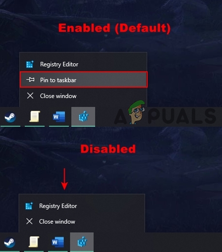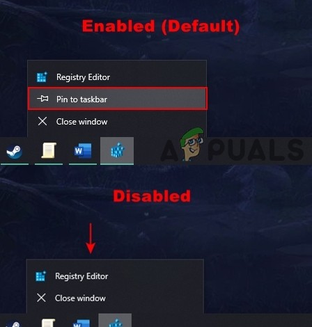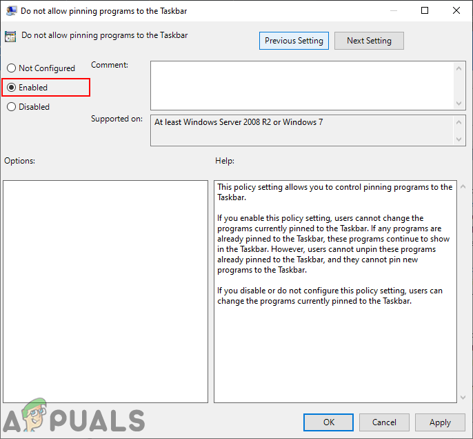 Enabling the setting - Click on the Apply/Ok button to save the changes. This will disable the Pin to Taskbar option from the Taskbar.