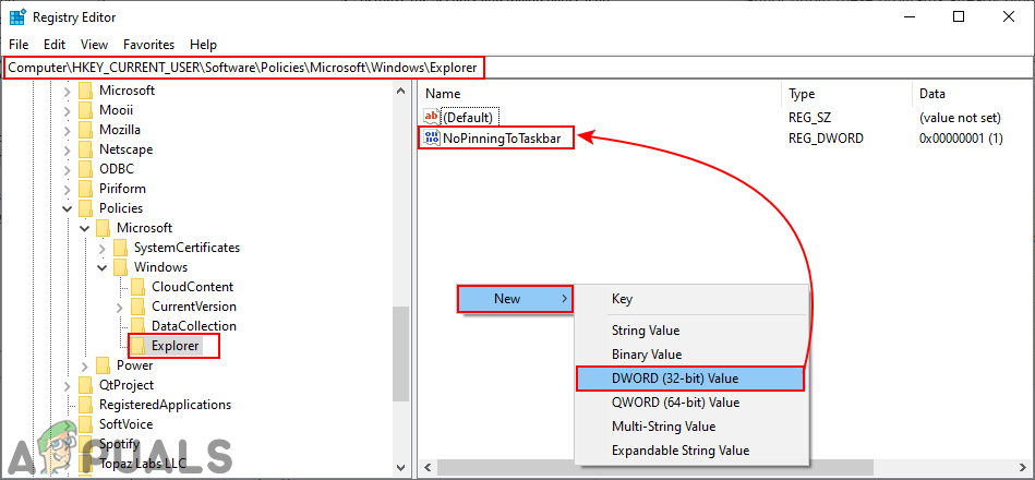 - Right-click on the right pane and choose the New > DWORD (32-bit) Value option. Name this value as “NoPinningToTaskbar“.