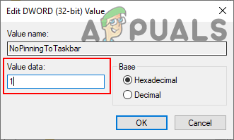 Creating a new value in the Registry Editor - Double-click on the NoPinningToTaskbar value and then change the value data to 1.