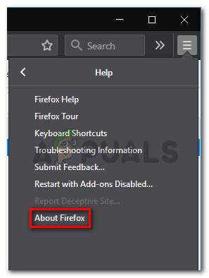 - Once you’re inside the action menu of your browser, go ahead and click on the Help tab to bring up the context menu, then click on the About Firefox entry.