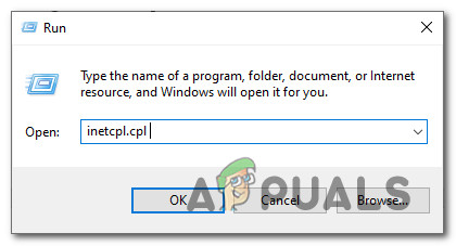 - Press Windows key + R to open up a Run dialog box. Next, type ‘inetcpl.cpl’ inside the text box, then press Enter to open up the Internet Properties tab.
