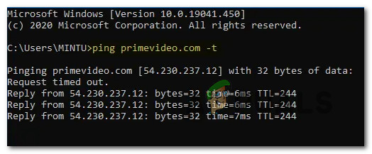 In case this investigation has returned mixed results, there’s one method of checking if the prime video server is accepting connections or not – You can ping the main server from a CMD prompt and see if you get a pingback or your request gets timed out.