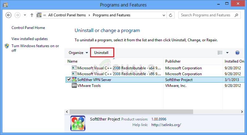 Opening the Programs and Features menu - Once you get to the Programs and Features menu, scroll down through the list of installed programs and locate the system-level VPN. When you see it, right-click on it, then click on Uninstall from the newly appeared context menu.
