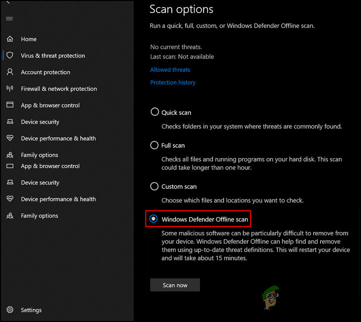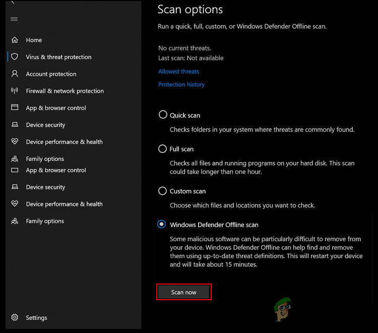 Once this is done, use Microsoft Windows Defender or your third-party antivirus software to run an offline scan to fix the Prime.exe issue.
