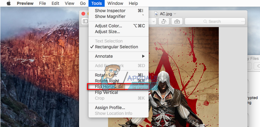 - While in Preview, click on the Tools menu and select Flip Horizontal.