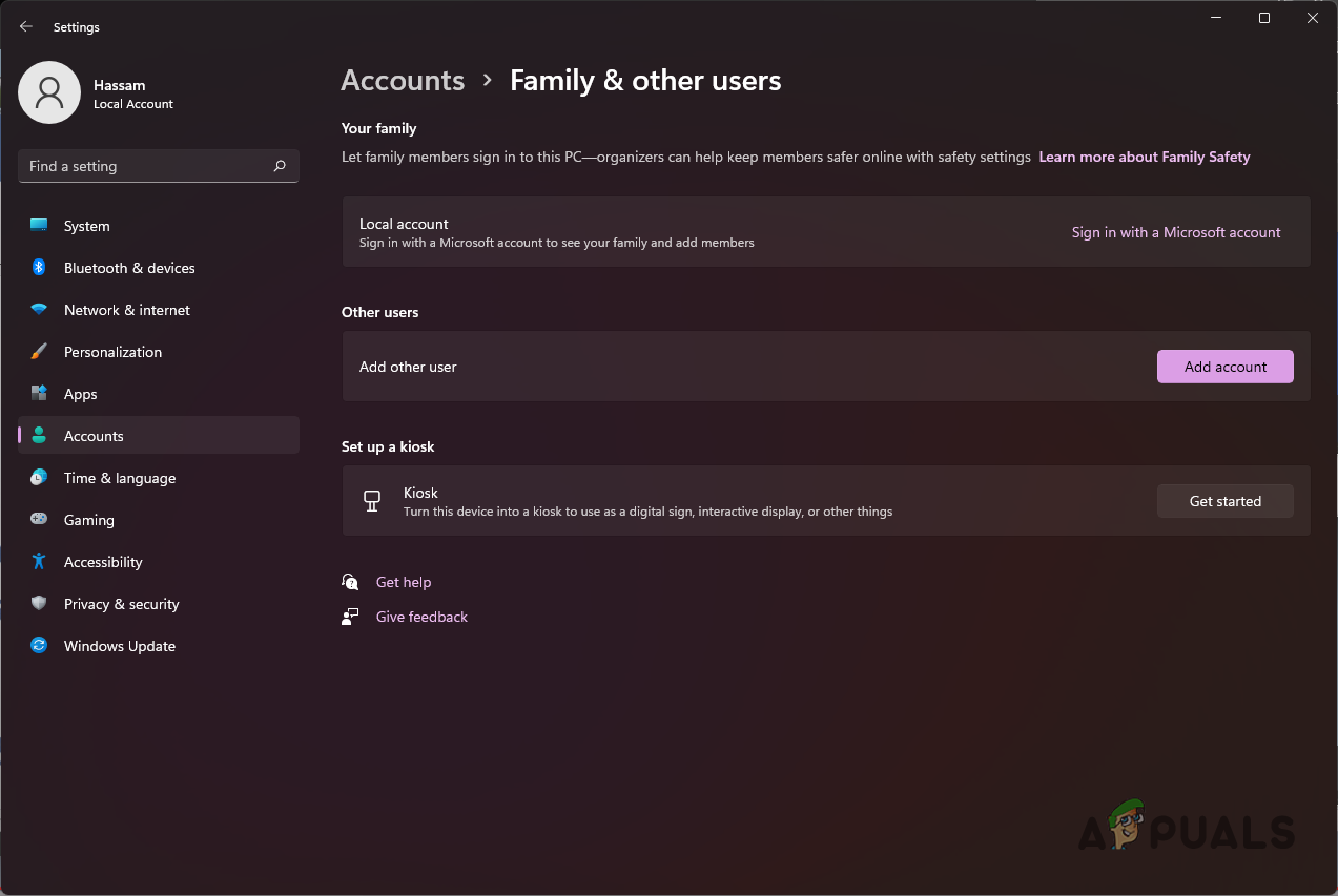 Accounts Settings - Once you are there, click on the Add account button provided in front of Add other user.