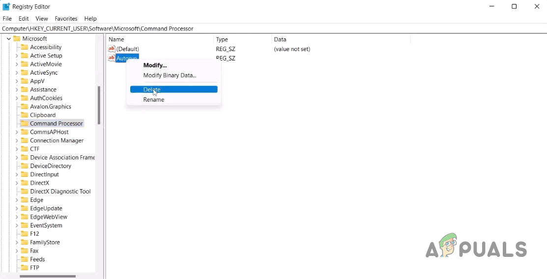 Navigating to Command Processor Path in Windows Registry - Once you are there, on the right-hand side, right-click on the AutoRun key provided, and from the drop-down menu, choose the Delete option.