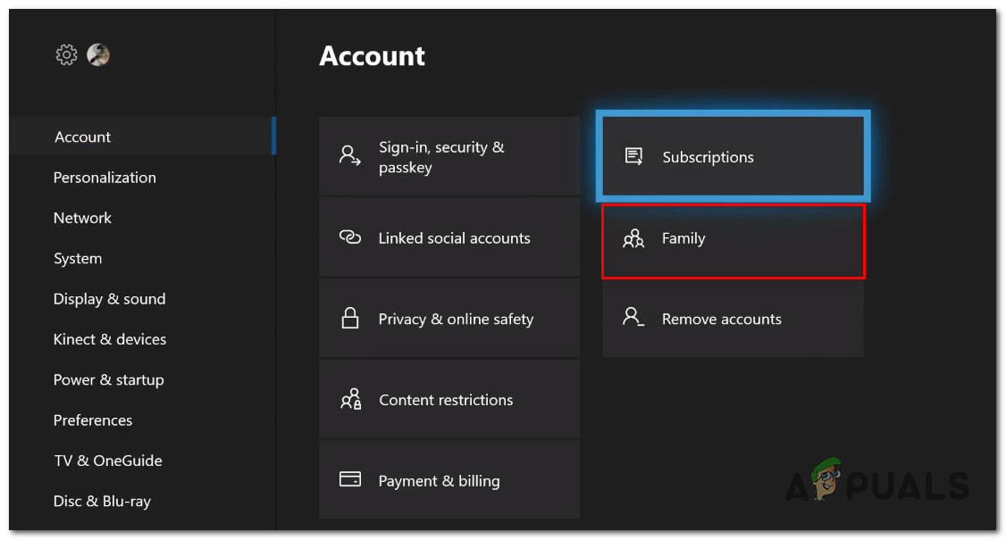 Accessing the Settings menu on Xbox One - Once you’re inside the Settings window, select Account from the vertical menu on the left, then move over to the right-hand side and access the Family menu.
