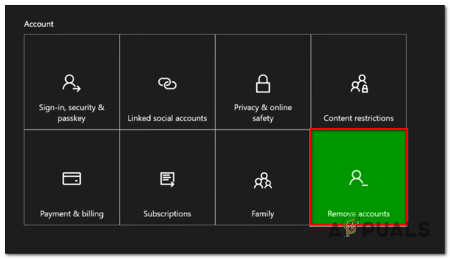 Signing out from your active Xbox account - After the account is signed out, it’s time to remove it. to do this, access the Settings menu once again, and select the Accounts tab from the vertical menu on the left. Next, move over to the right section and choose to Remove accounts from the list of available options under Account.