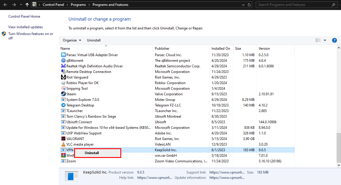 Typing in “appwiz.cpl” in the Run prompt - Scroll down to locate your VPN client in the list, right-click on it, and select Uninstall.