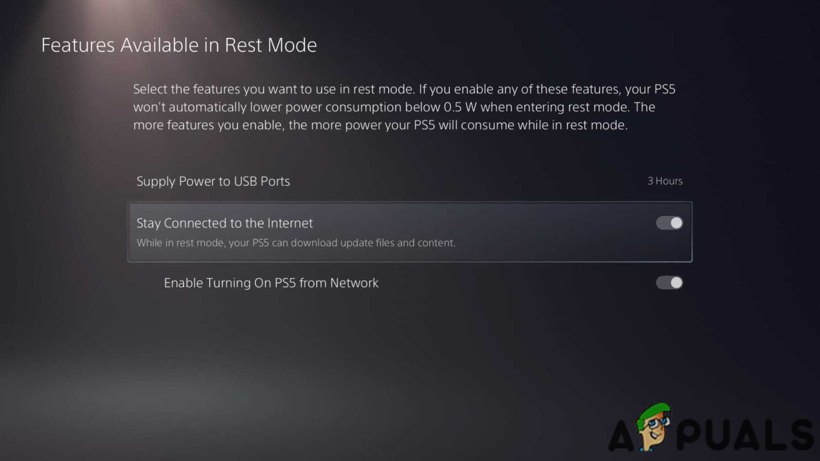 - Select “Features Available in Rest Mode,” then enable both “Stay Connected to the Internet” and “Enable Turning On PS5 from Network.”